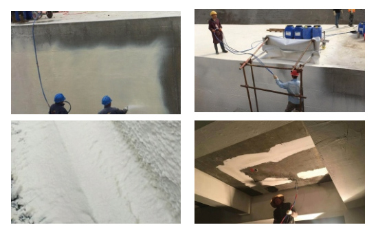 施工时分别加入氧化剂和还原剂,通过专用高压无气喷涂系统将配置好的两组药液等量输送到喷枪,喷出后在空气中发生撞击混合,高速喷射到基面,
